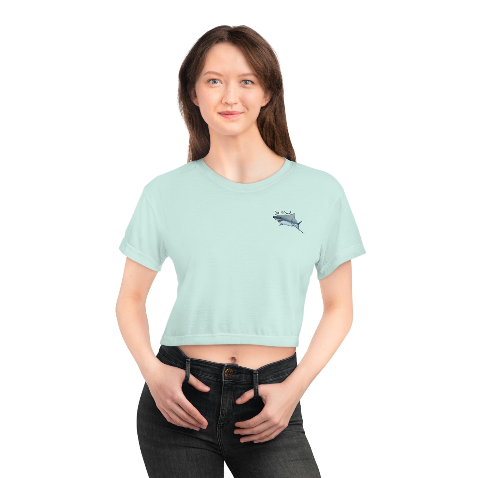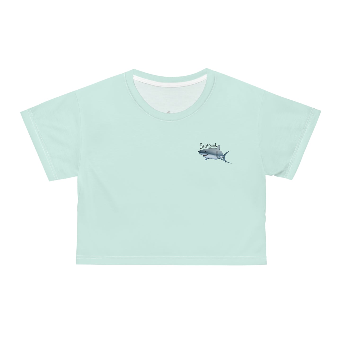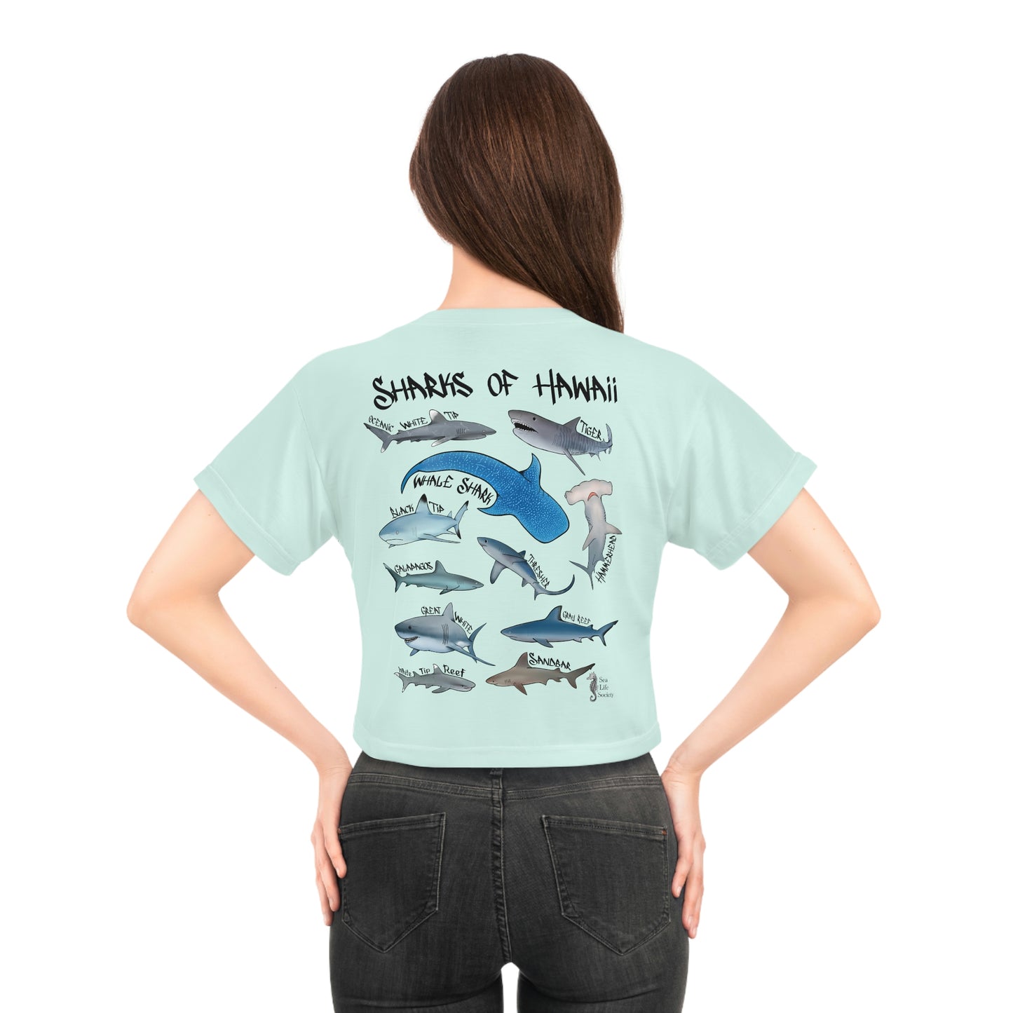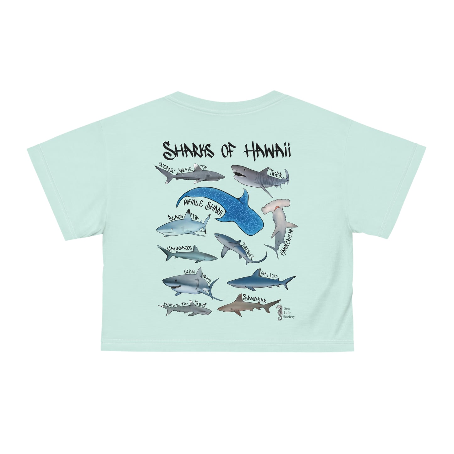 Introducing our Sharks of Hawaii cropped Tee, a bold and stylish garment that pays homage to the captivating sharks found in the Hawaiian Islands. This shirt features a striking sublimation print on the back, showcasing a mesmerizing collection of shark species. Crafted from 100% polyester using the sublimation printing technique, this shirt ensures vibrant colors that will never fade away.